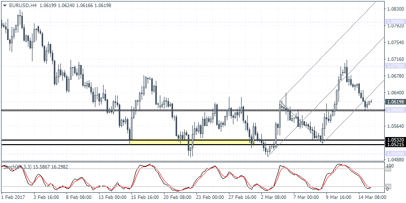 EURUSD (1.0619): EURUSD is likely to test the support at 1.0600 more firmly today although the current price action is showing signs of bullishness. A firm retest off 1.0600 could indicate upside bias in the single currency targeting 1.0700 with further continuation coming on a breakout above the previous high. To the downside, a close below 1.0600 could signal a decline towards 1.0532 – 1.0521 support level. However, the 4-hour Stochastics is currently pushing higher which could indicate a possible move to the upside. Expect EURUSD to remain range bound within 1.0700 and 1.0600 levels into the FOMC meeting.
