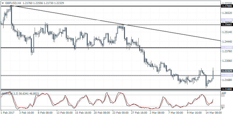 XAUUSD (1204.75): Gold prices slipped below 1200.00 but managed to post a strong reversal over the past 12-hours. This could indicate a near-term upside bias with gold prices likely to test 1217 – 1220 resistance as seen on the 4-hour chart above. With the central bank poised to hike rates for the third time ahead of today’s FOMC vote comes the consumer price index data which could be seen strengthening further. The precious metal is also likely to be supported by the developments from Europe which include the political developments in the UK as well as the Netherlands elections that are currently underway.