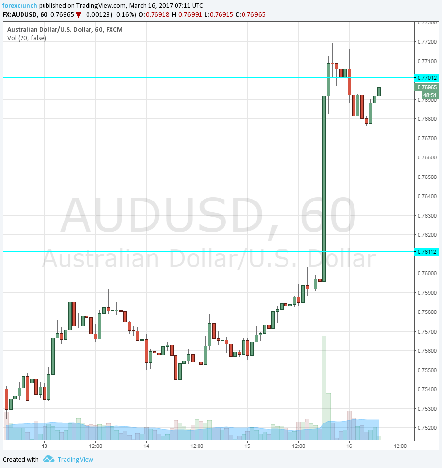 AUD/USD was on a tear, rising on the backdrop of the Fed’s “dovish hike“. The Federal Reserve raised interest rates as expected but did not alter any part of the outlook. See: 5 reasons why the dollar fell on the hike.