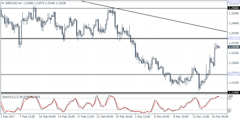EURUSD (1.0767): EURUSD advanced yesterday led by encouraging signs from the Dutch elections. The common currency closed at 1.0771 which is a strong resistance level that was firm on two previous occasions. A breakout above 1.0765 – 1.0800 resistance zone will no doubt be bullish for EURUSD which could extend gains to as much as 1.1100. On the 4-hour chart, there is a small risk of price pullback to 1.0700 on the rising wedge pattern. This could, however, put the bullish bias into question as a break down below 1.0700 could signal near term declines towards 1.0600.