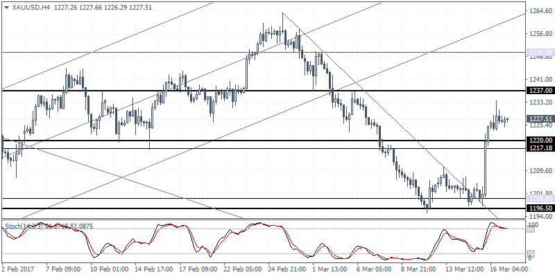 XAUUSD (113.25): Gold prices continued to rally for the second day after the FOMC meeting. The price touched an eight-day high at 1233.66 yesterday before pulling back lower to close the day at 1226.45. Resistance is seen at 1240 – 1235 level on the daily chart which indicates near term sideways range with support seen at 1200.00. On the 4-hour chart, gold prices could continue rising towards the support/resistance price level of 1237.00 following which we can expect to see a pullback towards 1220.00.