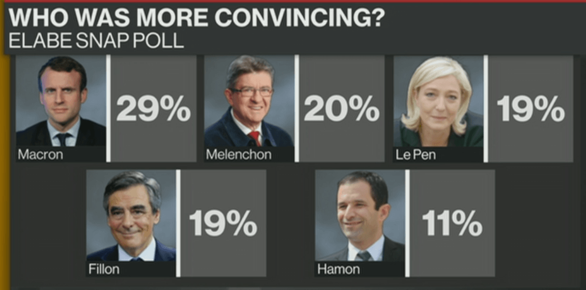 A three-hour+ long televised debate (#LeGranDebat) encompassed a wide variety of topics concerning French voters. Emmanuel Macron, the young, former socialist that is running independently on a centrist platform, seems to have come on top.