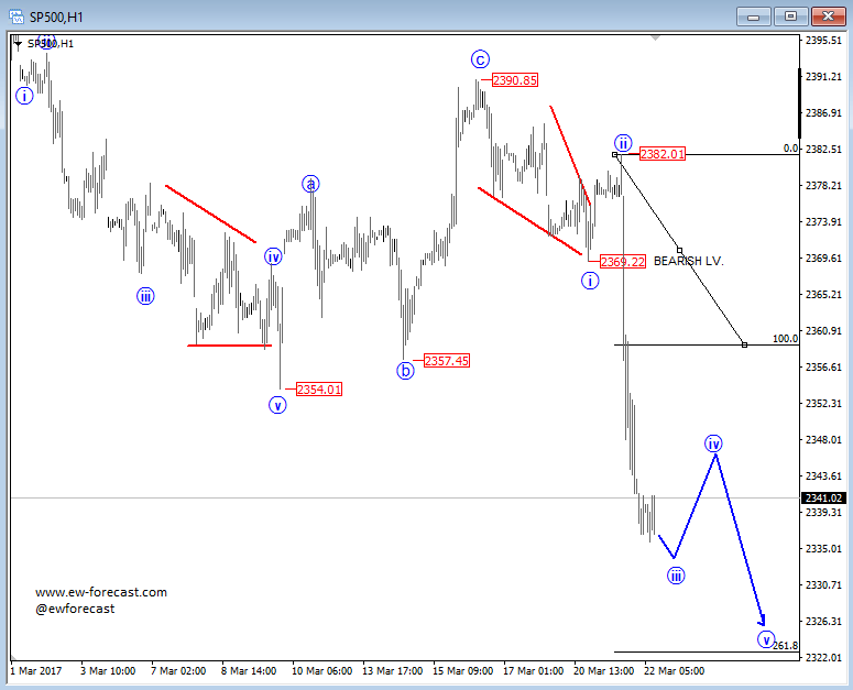 Stocks are also in a nice intraday downtrend, which is expected to continue through the next few sessions, as we need five waves down from 2390 before the market may turn higher again. So for now, let’s stick with the falling prices, meaning that the next short-term bounce will be limited, likely wave four of an ongoing decline that can extend down to 2320 area.