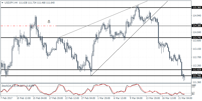 USDJPY (111.64): USDJPY extended the declines sharply and broke past the 112.00 support level yesterday. The downside momentum is expected to slowdown in the near term, but any corrections can be expected only a break out above 112.00. To the upside, the resistance level is seen at 114.00 – 113.78 where the initial resistance remains, followed by a test to 114.50. However, if USDJPY fails to break out above 112.00 then expect to see the price to consolidate below 112.00 for the short term with no clear direction in place.