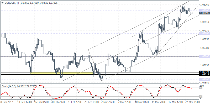 EURUSD (1.0789): EURUSD continues to hover near the 1.0800 support/resistance level although the chart pattern indicates continued downside in prices. The bullish rally from the lows of 1.0500 is showing signs of exhaustion, but further upside can be expected only on a break out above 1.0800. To the downside, a break out from the rising wedge pattern indicates the initial downside towards 1.0700 followed by an extended decline that could target 1.0650.