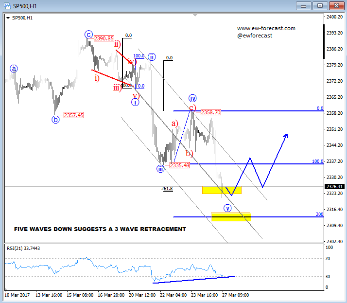 We expect the dollar index to hit new lows of the year as EURUSD breaks above 1.0800, while stocks sold-off as Trump’s health-care bill fails. E-mini S&P500 has extended its weakness from last week down to 2320 area which was our projected zone for a fifth wave of decline, highlighted last week. The question is, what is next. Well, if you are familiar with the Elliott Wave principle, then you know that the market can be ready for a bounce this week if we consider that after every five wave trend there will be a change in three legs minimum, no matter what is the structure on a higher time-frame charts. So, from a technical perspective, and also from a psychological point of view, when others are turning aggressively bearish on stocks, we suspect that a three wave of retracement may show up on stocks, but it may be just another temporary recovery. Divergence on the RSI also indicates a potential turn. We see the first support zone here near 2320 while the next one stands near 2310.