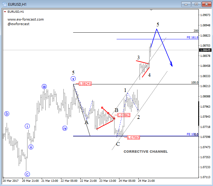 EURUSD is on the rise which we assumed would happen after only a three wave decline from 1.0824 that we labeled as a corrective move. Notice that since then, the market turned sharply higher, clearly in impulsive fashion that already shows five sub waves up from 1.0759, thus a reversal point may not be far away. Technically speaking we see a resistance at 1.0880-1.0900 region.