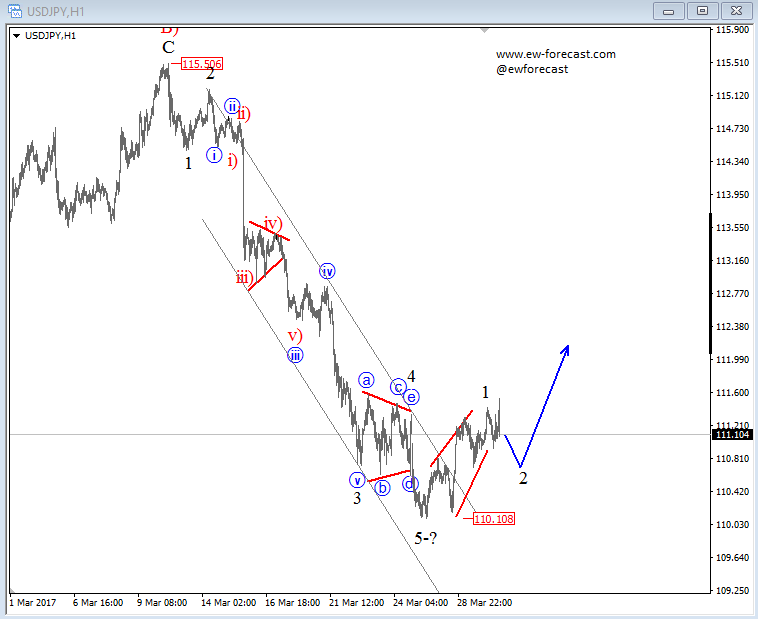 USDJPY turned nicely up from 110.10 low as warned at start of the week when we saw a breakout of a triangle, so we know that the market was in the late stages of a five-wave movement. So far, we have seen a nice turn up, out of a downward channel which can be a new confirmation for a turn that might begin with a leading diagonal placed in wave 1.