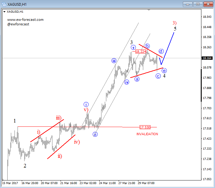 Silver has seen some downside today towards 18.00 where the market found a support 30mins back so this fourth wave now looks more and more like a triangle and not a flat. However, it’s also a corrective wave that occurs within an ongoing trend so we will stick with the bullish view towards 18.40/50 for wave five.