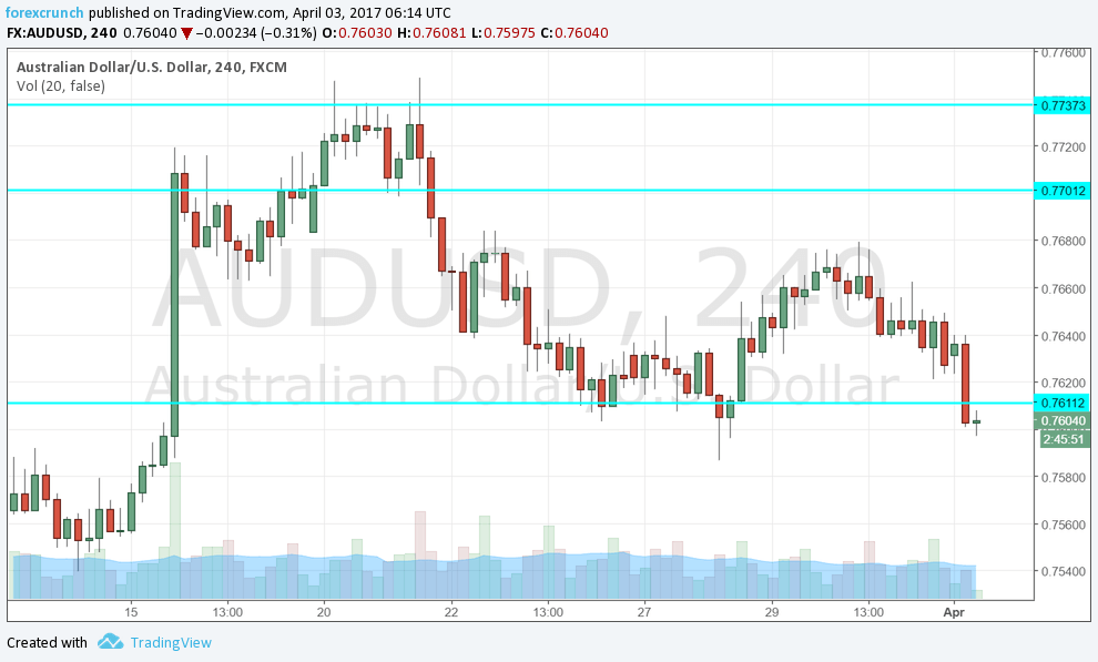 The Australian dollar begins the second quarter of 2017 with a downfall. AUD/USD is struggling to hold onto the 0.76 level, just under support at 0.7610. The pair has been trading in the 0.7610 to 0.77 level for quite some time.