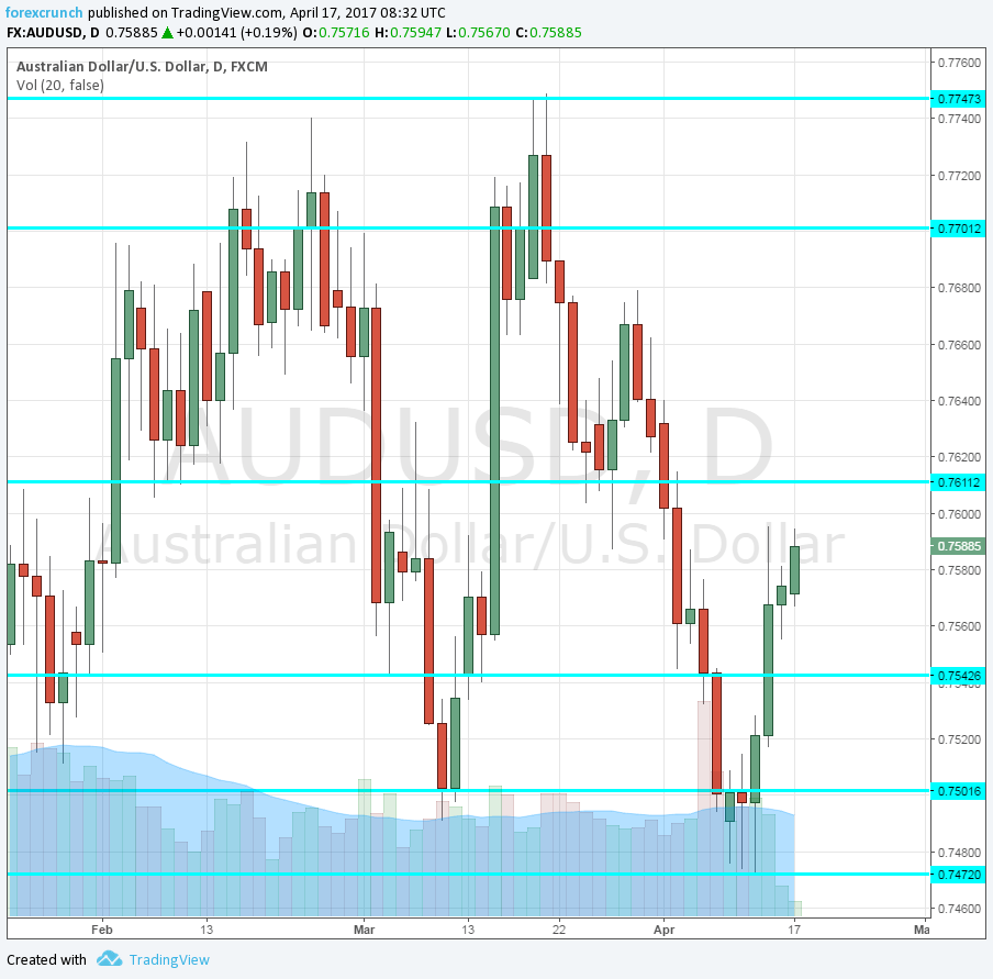 The Australian dollar extends its gains and edges closer to the previous, higher range. AUD/USD is trading at 0.7589. It seems clearer that the stubborn support at 0.7472 marked a bottom for the pair.
