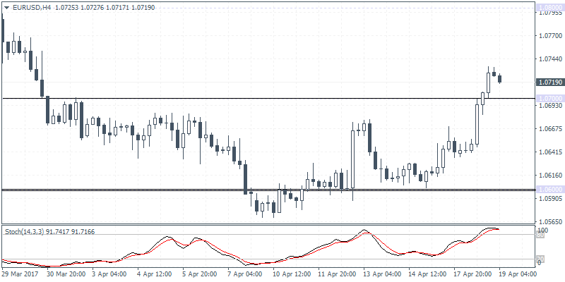 EURUSD (1.0719): EURUSD is currently moving counter trend after prices fell to 1.0600 last week. After consolidating near this level, EURUSD posted two days of strong gains as price action was seen clearing the 1.0700 resistance level yesterday. Any pullbacks will likely see 1.0700 being tested in the near term, ahead of what could be a strong rally towards 1.0800 where resistance is most likely to be tested in the near term. Following the rally to 1.0800, we expect EURUSD to remain range bound within 1.0800 and 1.0600 into this weekend’s French elections.