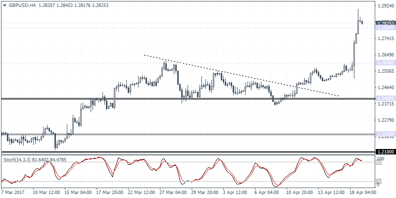 GBPUSD (1.2825): The British pound has posted strong gains after prices were stuck near the 1.2400 support level The rally yesterday sent GBPUSD to breach past 1.2600 and 1.2800 levels, marking a 6-month high in prices. On the 4-hour chart, the gains came following an upside breakout from the descending triangle pattern where support was formed at 1.2400. Any pullbacks could be seen touching down to 1.2600, which marks the resistance level that was previously held. Establishing support here could pave the way for GBPUSD to test 1.3000 in the near term.