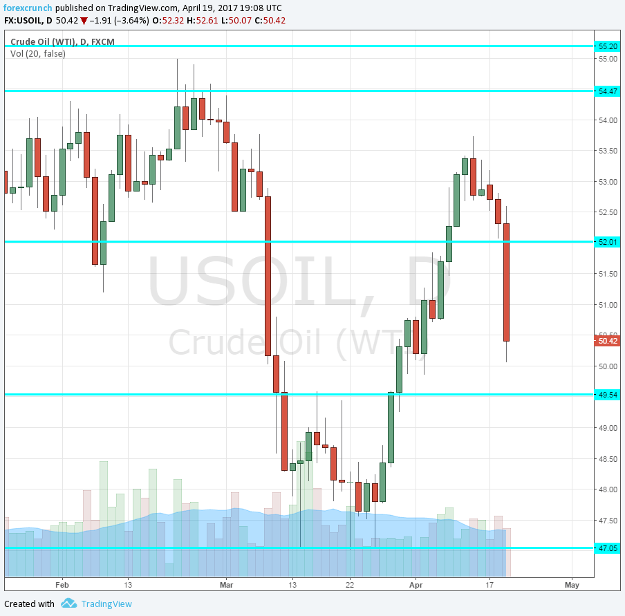 WTI Crude Oil dropped by some $2 to $50.38, or nearly 4% on the day. This is still within the recent ranges, but quite a drop. Why is oil slipping lower?