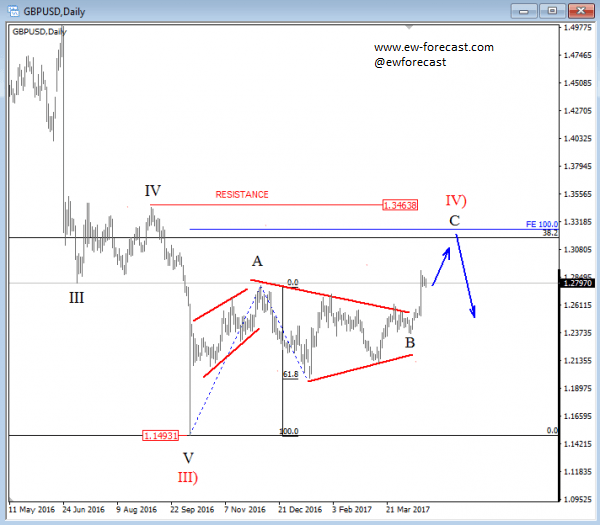 On the 4h chart we can see cable making a strong rise away from 1.2364, clearly in an impulsive fashion which can see an extension up to 1.3140 area for wave C. That said, the recent slow price activity was sub-wave 4), which may have already found a base and the current intra-day rally may be the start of sub-wave 5) of three.