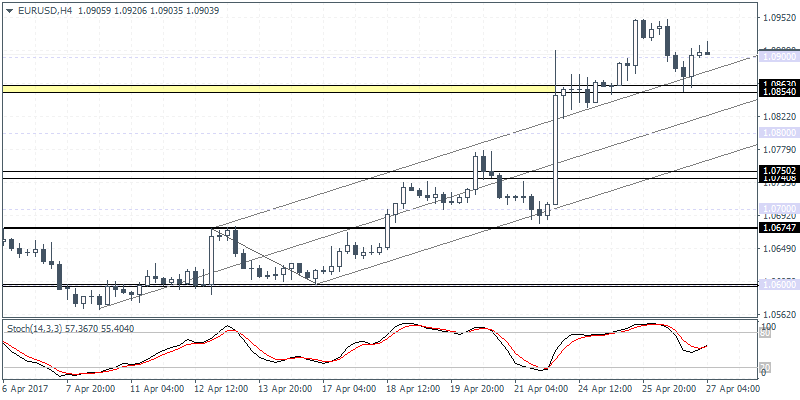 EURUSD (1.0903): EURUSD formed an outside bar yesterday which comes after two straight days of solid gains posted by the common currency. With the ECB meeting due later today, the euro could be seen coming under pressure.  The recent weakness in the inflation data could possibly keep the ECB on a dovish tone although there is potential for central bank officials to acknowledge that recent pickup in the economic activity. Unless EURUSD breaks out above 1.0941 to post a new high, we can expect to see a correction in store. A breakdown below 1.0850 will trigger further downside towards 1.0750 – 1.0740 where there initial support exists followed by a move towards 1.0675.