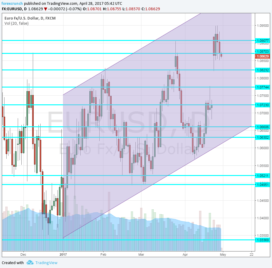 Centrist Emmanuel Macron topped the first round of the French elections and markets cheered. Macron is expected beat extremist Le Pen in the second round. His probable election is a sigh of relief for the European Union. ECB President Mario Draghi took the euro for a ride. He started off with optimism, talking about better growth and diminishing downside risks. Yet after sending the euro higher, he showed more caution on inflation and said there was no discussion on an exit strategy. This sent EUR/USD back down. The common currency got a boost from inflation data. Core CPI s up 1.2%, the highest since 2013. In the US, Trump completes his first 100 days in office with a mixed dollar. US GDP grew by 0.7% annualized in Q1 2017, worse than expected and the lowest in three years.
