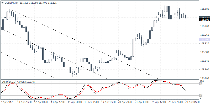 USDJPY (111.12): USDJPY is seen consolidating above the support level 111.00 where prices are being held steady. A breakdown below 111.00 could, however, spell trouble as a decline to 109.50 is quite likely. Price action closed with an inside bar in yesterday’s session which could signify a potential break out in the near term. To the upside, strong resistance is seen at 112.00 – 111.97 which will need to be breached to ascertain further upside in prices.