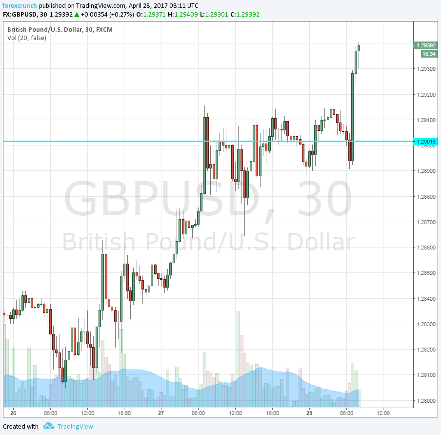 GBP/USD is trading at 1.2915. The pair jumped all the way to 1.2944 but retreated in the very last minute ahead of the publication. Support awaits at 1.2770, which was the bottom of the range since PM Theresa May announced an early election.