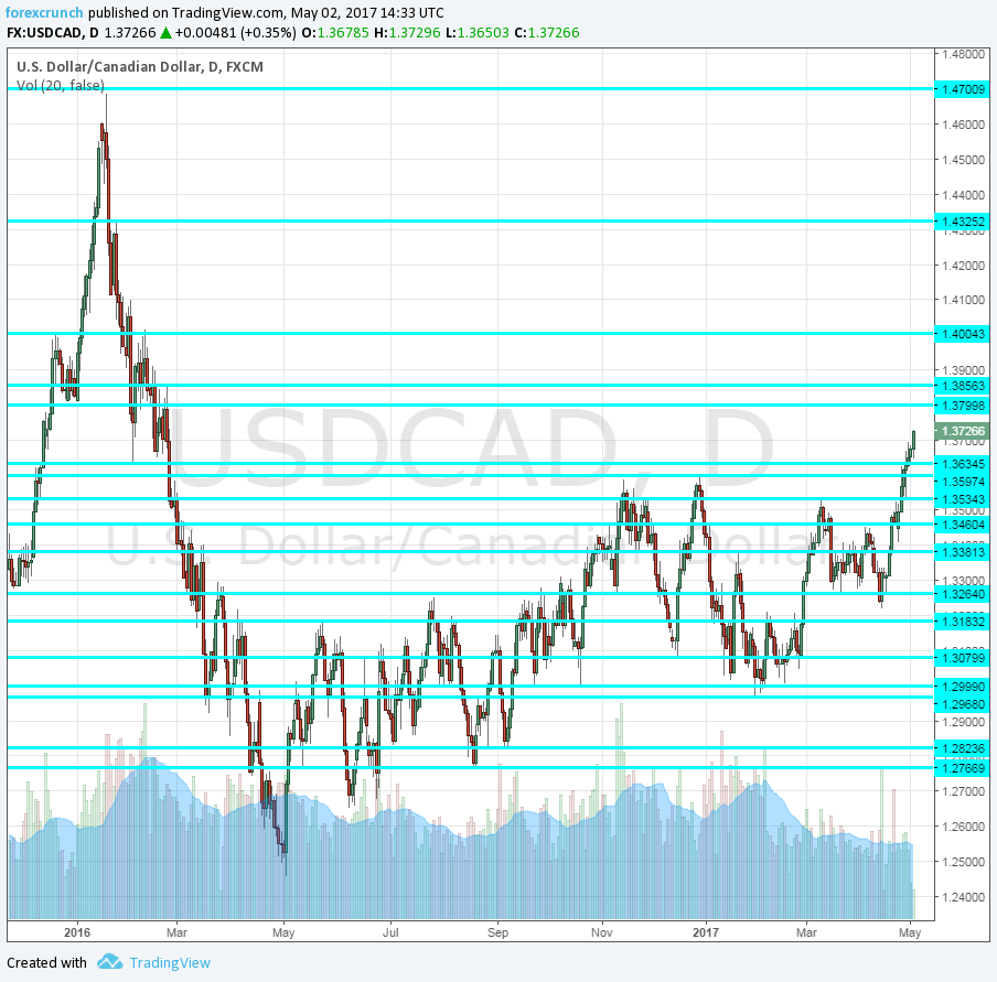 USD/CAD currently trades at 1.3740. The pair has strong momentum after making the break. What levels should we look out for?