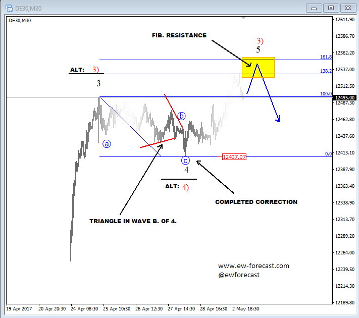 We have seen DAX push up to a new high on in the last 24 hours which has been expected from an Elliott Wave point of view since the decline down to 12413 has unfolded in three waves. It was a corrective set-back that put a new impulse leg higher in play, which we see as the fifth wave. That’s a final leg within a higher degree pattern so a change in trend may occur in the near-term. Technically speaking a three wave reversal lower may occur from around 12540-12560 zone.