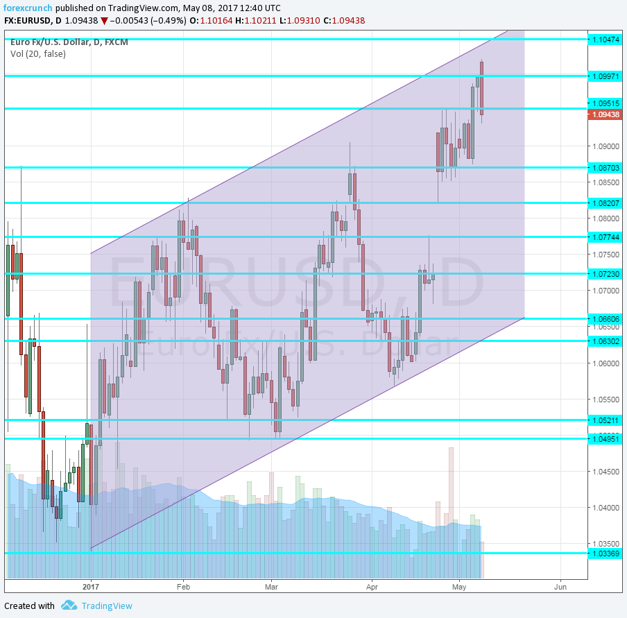 Ahead of the vote, we wrote that the risk is asymmetric: a victory for Macron is mostly priced in while a Le Pen one would be a total shocker. Indeed, euro/dollar climbed to 1.1021,  a new peak for 2017 and the highest in over five months. However, this did not last too long.