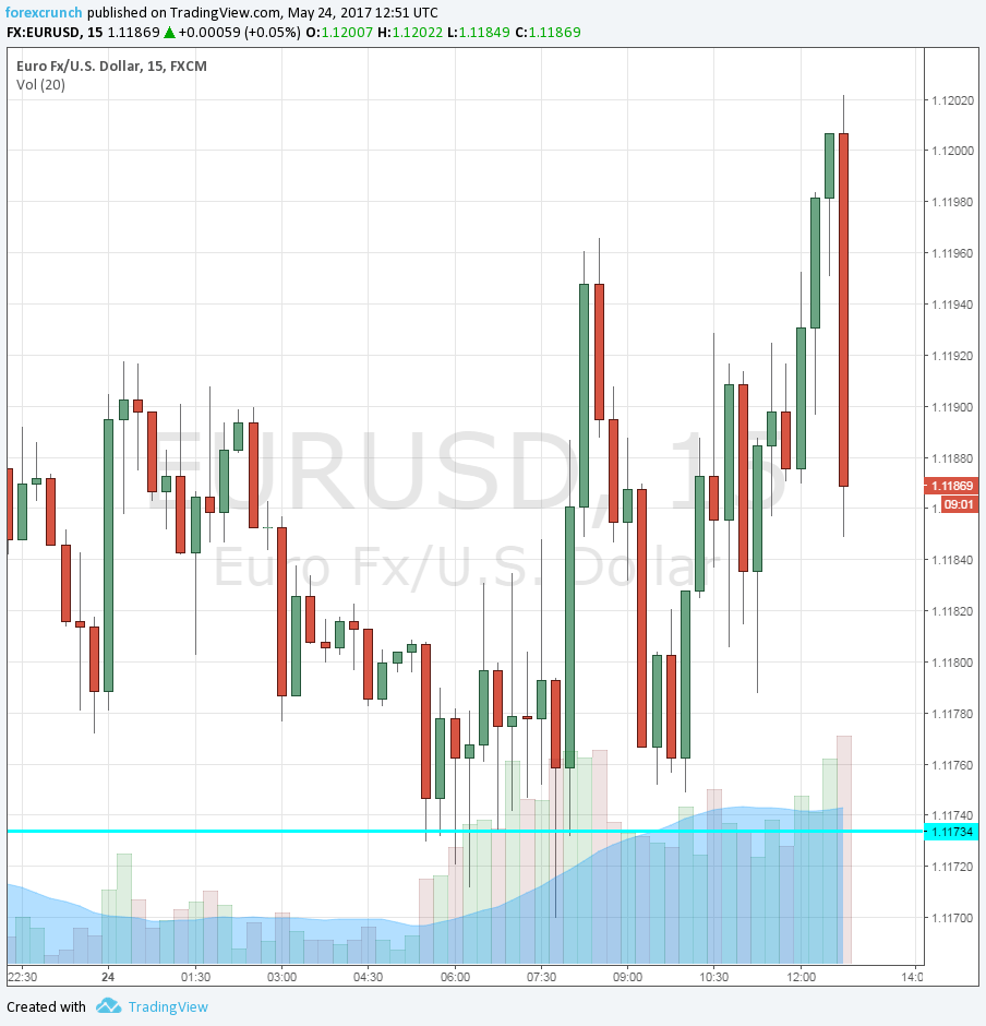So, if Draghi shrugs off rising inflation, the scope for tapering is low. And on this basis, the euro loses ground. Here is the 15-minute chart. The text of his speech was published at 12:45 GMT: