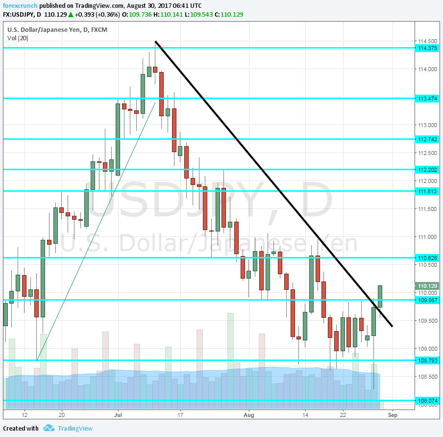 Fewer safe-haven flows and good data send the pair higher. The high so far is 110.16, above the very round 110 level. Perhaps more importantly, the pair is trading above downtrend resistance, as demonstrated in this chart.