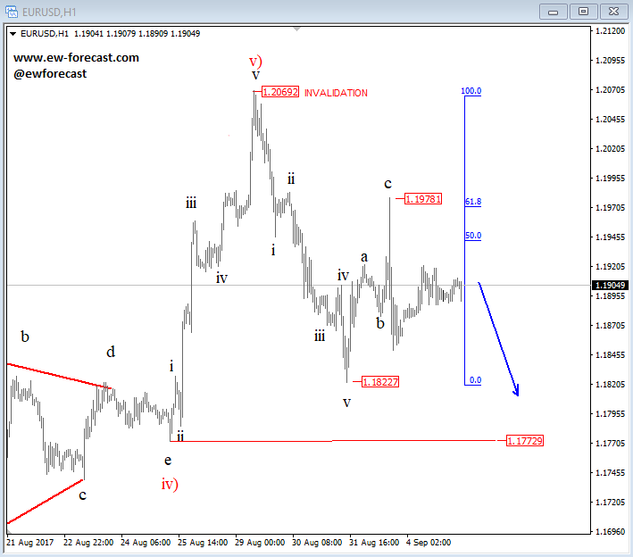 On EURUSD we are waiting on a third leg of decline, that can send the price to 1.1772 support this week while the market is below 1.19778, but real invalidation should remain at 1.2069 high. So as long as this price is untouched we expect a weaker EUR.