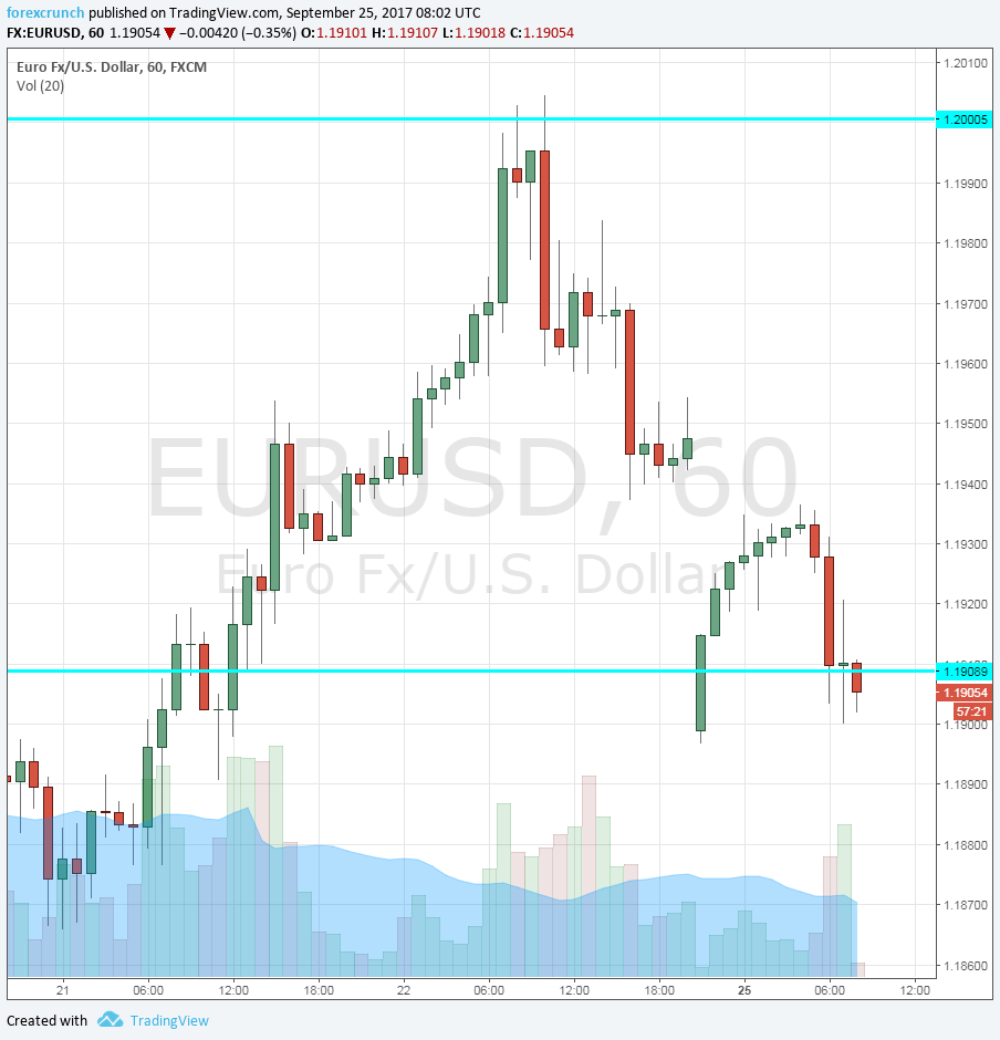 EUR/USD was trading lower, around 1.1907. The elections resulted in a fractured parliament. Merkel’s party came out first and will leave the government, but received fewer votes than expected. The extreme-right AfD came out third.