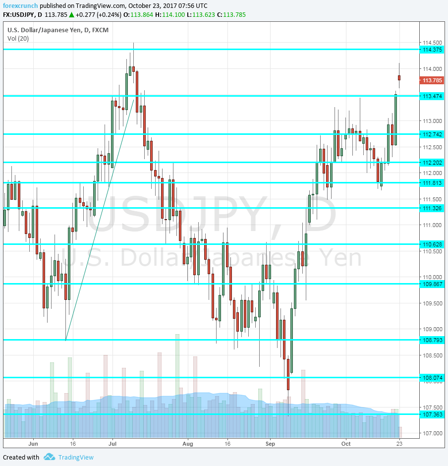 And with more potential spending, the currency is lower. USD/JPY is moving higher. Can it break resistance at 114.50?