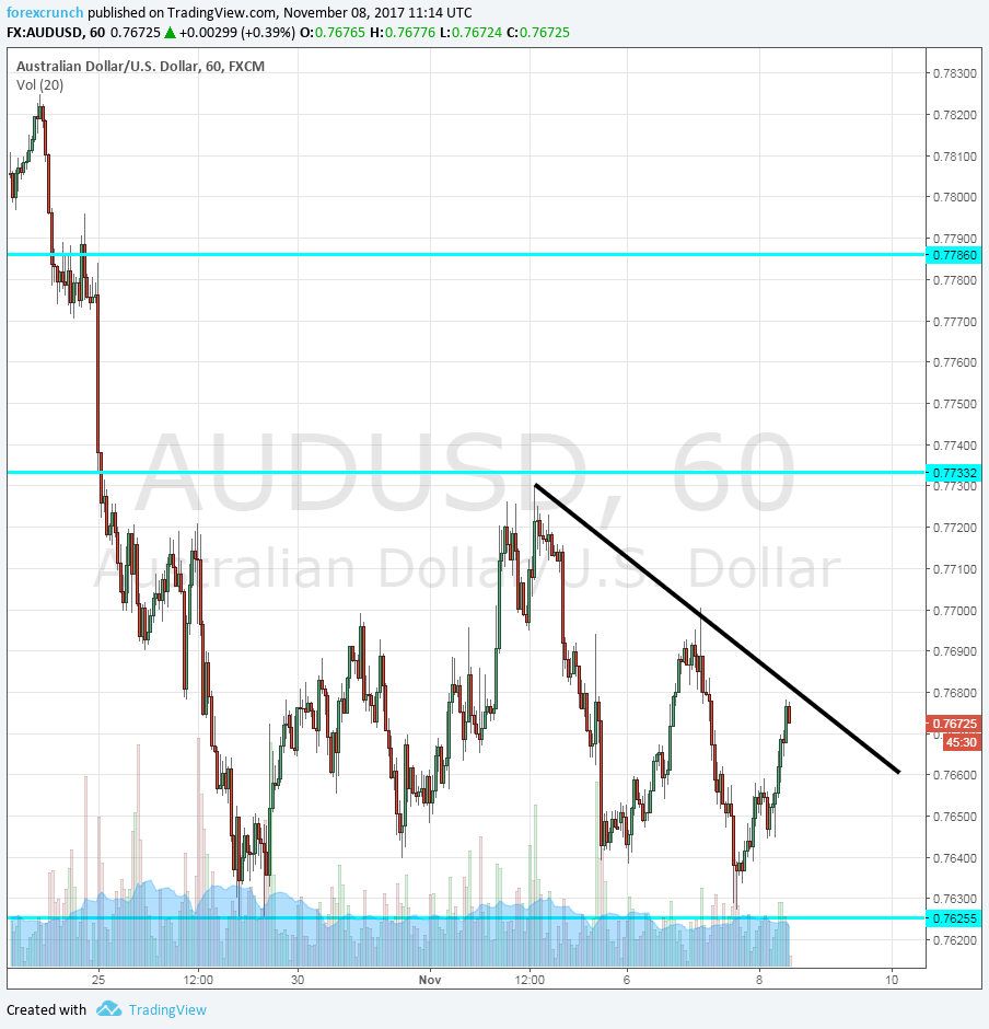This is the case today as well. After falling to the support line, the pair is now trading some 50 pips higher, around 0.7675, more or less in the middle of the range. Yet a closer look at the hourly chart shows a tendency to the downside.