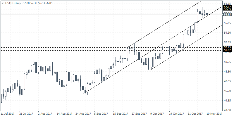 With the price level of 52.25 – 51.82 previously serving as resistance, the break out from this level saw little retest to establish support. The strong rally to 57.87 also came with little pullbacks. This would suggest that exhausting momentum near the current highs could send oil prices falling back to 52.25 – 51.82 in the near term.