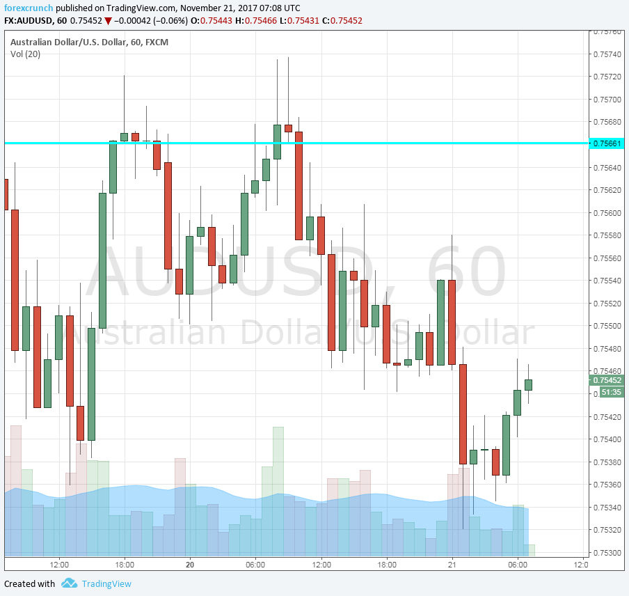 Here are how the recent moves look on the chart. Further support awaits at the round number of 0.75. Resistance is around 0.7640.