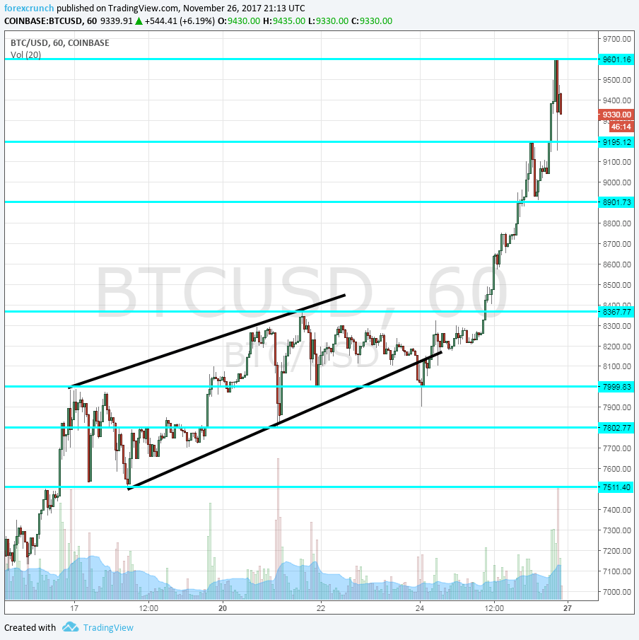 Bitcoin does not rest on the weekend. The cryptocurrency, which was confined to a narrowing channel, made a clear breakthrough out of those level and hit new highs. A break of the previous top of $8367 was broken during the weekend and the new high is $9596, just 404 dollar away from the magic 10,000 USD level.