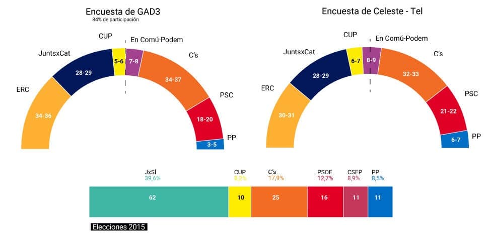 Here are two polls from today that show a very close struggle between the pro-independence parties in light orange, black and yellow, and the unionist parties in dark orange, red, and blue. The party in the middle, in purple, is Catalnunya en Comu. The party is backed by Barcelona Mayor Ada Colau and they support a binding referendum but reject both a unilateral declaration of independence and also the suspension of the autonomy. The polarization did not help them.