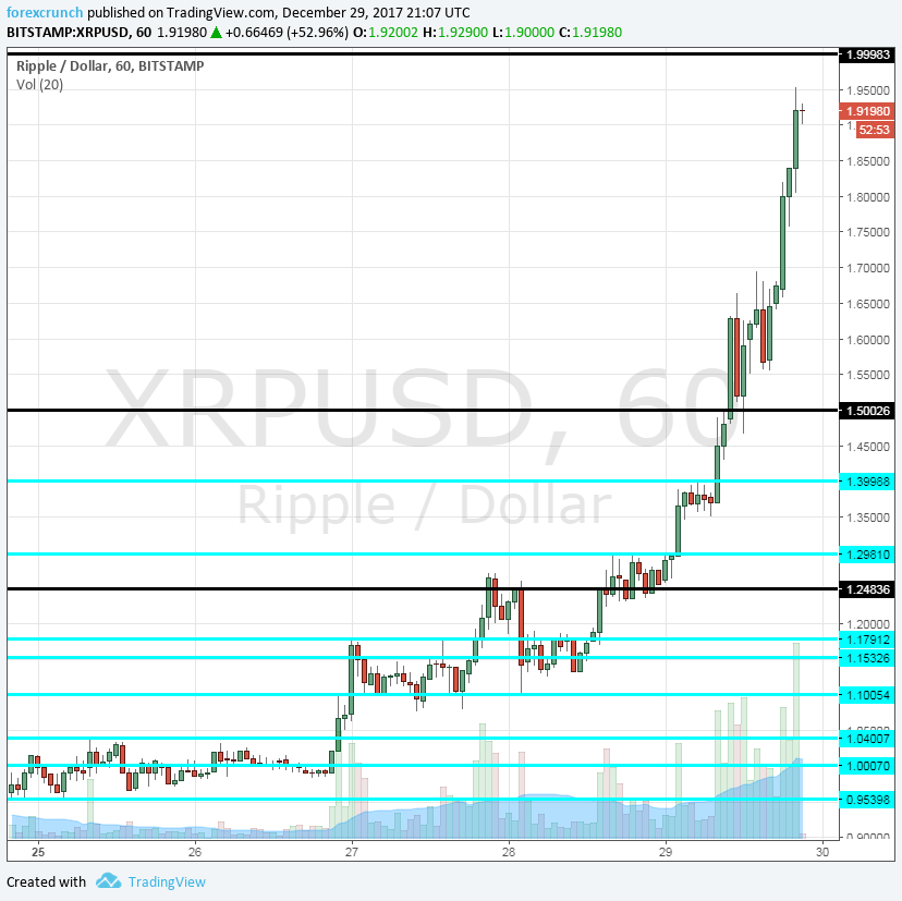 The price of Ripple, the cryptocurrency that Japanese banks are warming to, is not stopping after the big break above $1.50. At the time of writing, XRP/USD is trading at around $1.93 according to the Bitsmap exchange. The high so far has been $1.95. Ripple at $2 is getting close less than a week after the price hugged the $1 level.