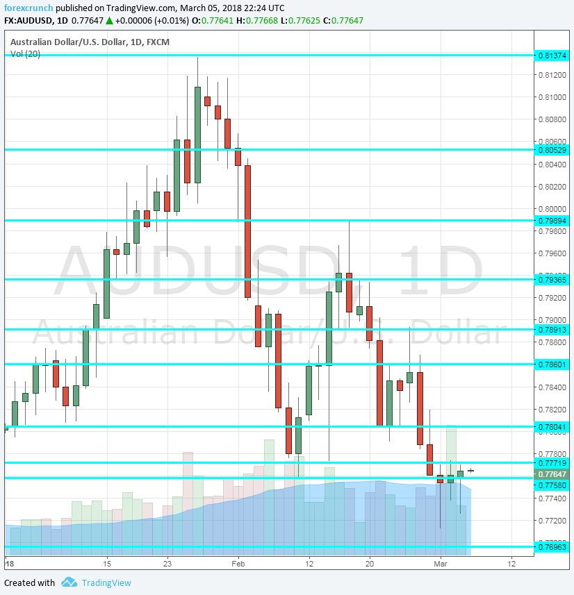 0.7760 was the low point in mid-February and works as support. The round level of 0.77 was resistance in December.