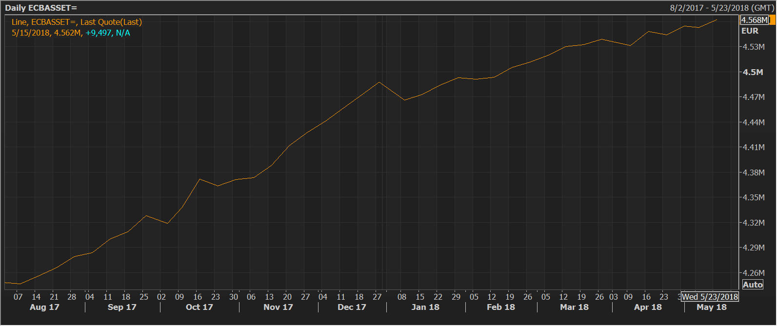 The common currency could continue losing altitude in the near future as the ECB and the Fed continue to move in opposite directions. The ECB balance sheet has expanded to a new lifetime high – the total assets rose by another €9.5bn to €4,562.1bn. On the other hand, the Fed is tapering its balance sheet.