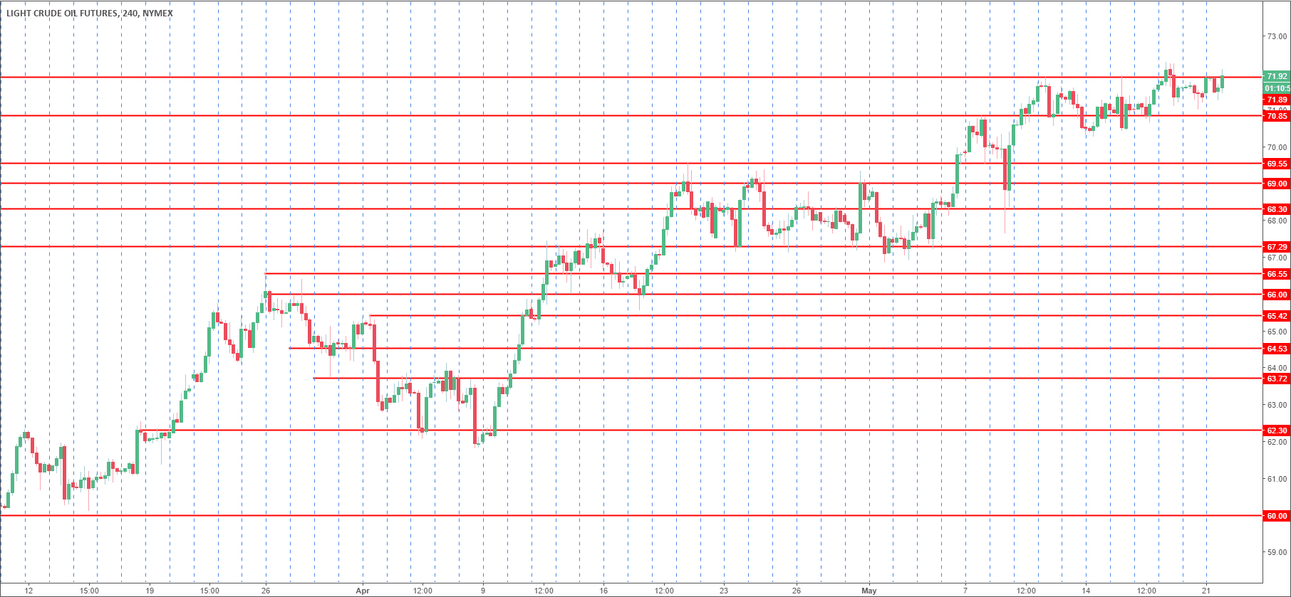 Slobodan Drvenica at Windsor Brokers wrote: “bulls eye fresh 3 ½ year high at $72.28 (posted on 17 May), break of which would expose Fibo projections at $72.48 & $72.85 (138.2% & 161.8% respectively), with stronger bullish acceleration expected to open $74.94 (Oct 2011 low) and $76.35 (Fibo 61.8% of 107.45/$26.04 fall) in extension. Top of thick rising 4-hr cloud ($71.08) and ascending 10SMA ($71.13) mark solid supports which should ideally contain dips and keep bulls intact. Res: 71.86; 72.28; 72.48; 72.85. Sup: 71.13; 70.65; 70.25; 70.00.”