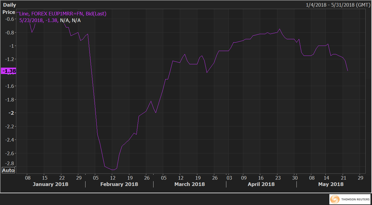The EUR/JPY one month 25 delta risk reversals (EUJP1MRR) fell to -1.38 on Wednesday – the lowest level since March 23 – vs. -0.75 seen in April 24.