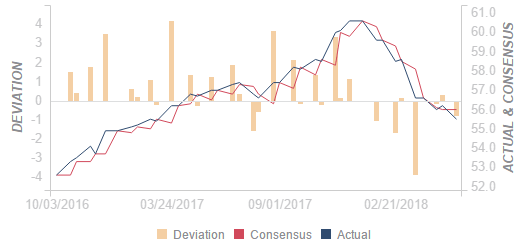 European Monetary Union Markit Manufacturing PMI came in at 55.5 below forecasts (56) in May