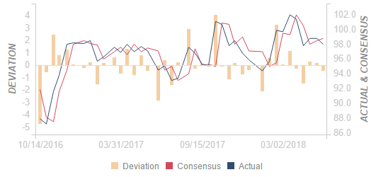 United States Michigan Consumer Sentiment Index below forecasts (98.8) in May: Actual (98)