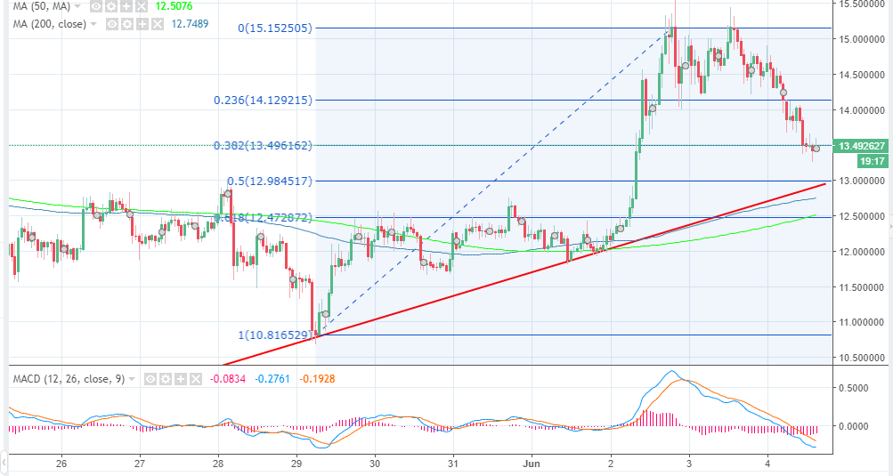 At the moment, EOS price has breached the support at the 38.2% Fib retracement level with the last high leg at $15.15 and a low of $10.81, The MACD is extending into the negative region while the moving averaged point towards a prevailing bear trend in the short-term.