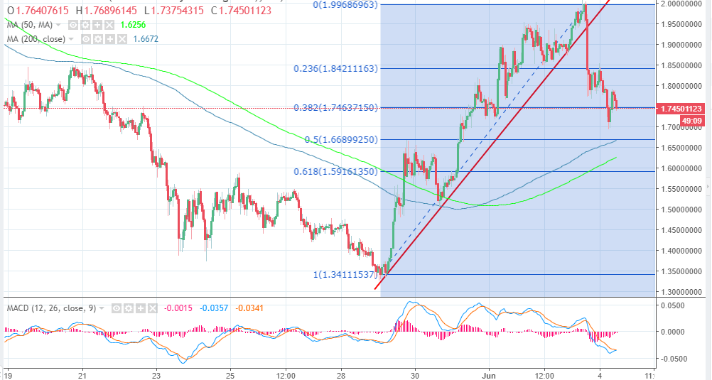 IOTA has been on a journey of breaking barriers since the April 29. An upside movement was initiated around the lows of $1.34 supported by the bullish trendline. IOT/USD continued on the trend breaking past $1.90, however, the bulls encountered stiff resistance short of $2.0 which in turn opened the gate for sharp declines.