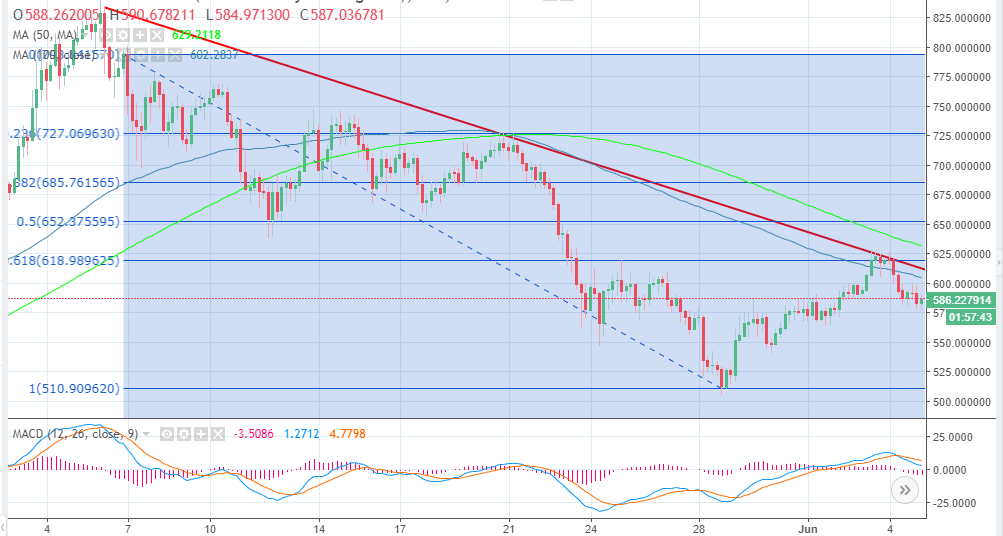 In the meantime, Ethereum price is currently trading at $586, the upside has been limited below $600. A break above the key resistance at $600 will see ETH/USD battled to break above the bearish trend line, which is close to the 100 SMA. The key support area at $580 has stood strong in the last couple days. This support will continue to hold the price until the close of the session on Tuesday. The nest demand target is at $570, if Ethereum price extends declines to this level, then $550 will be within reach.