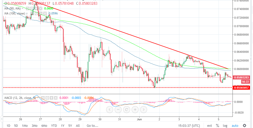 Tron price is fighting to keep above the short-term support at $0.58 after recovering from slide at $0.056. There is a falling wedge pattern in the making on the 1-hour timeframe chart. The 50 SMA coincides with the descending trendline indicating that the breakout lies at $0.060.