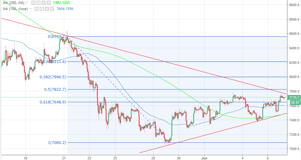Bitcoin price led a brief bullish spike during the session on Wednesday, the 61.8% Fib retracement level with the last high leg of $8,559 and a low of $7,090 prevented further gains towards $7,000. However, BTC/USD spiked again on Thursday Asian trading hours, while using $7,500 as a support. It attacked the retracement level above, this time breaking the key resistance at $7,000 and is now trading marginally above $7,700. The contracting triangle will offer resistance towards $7,800, but the psychological $8,000 is still out of reach for now. On the flipside the 61.8% Fibo will now offer support, besides a stronger support is provided by the 100 SMA at $7,400.