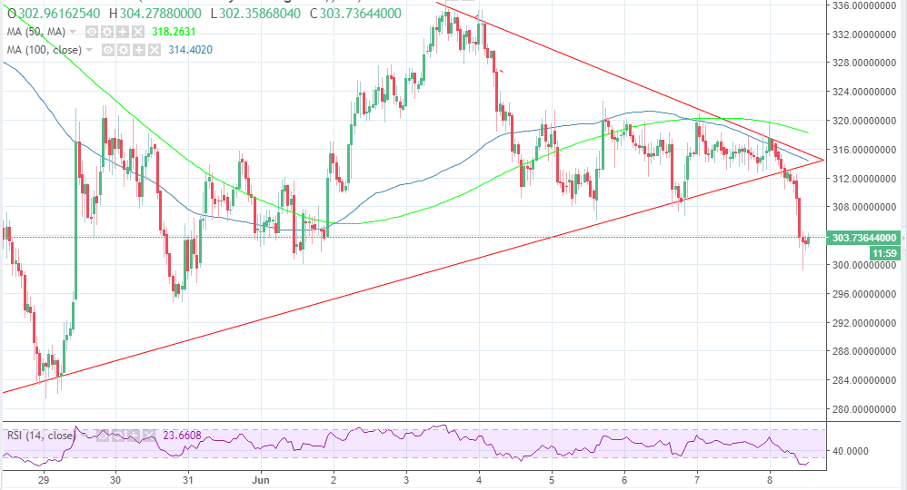 Dash price continues to correct lower on the, besides it is testing the key support area at $300. DASH/USD has broken below the contacting triangle after rejecting the support area at $316. The prevailing trend in the market is bearish while the upside has been capped at $320.