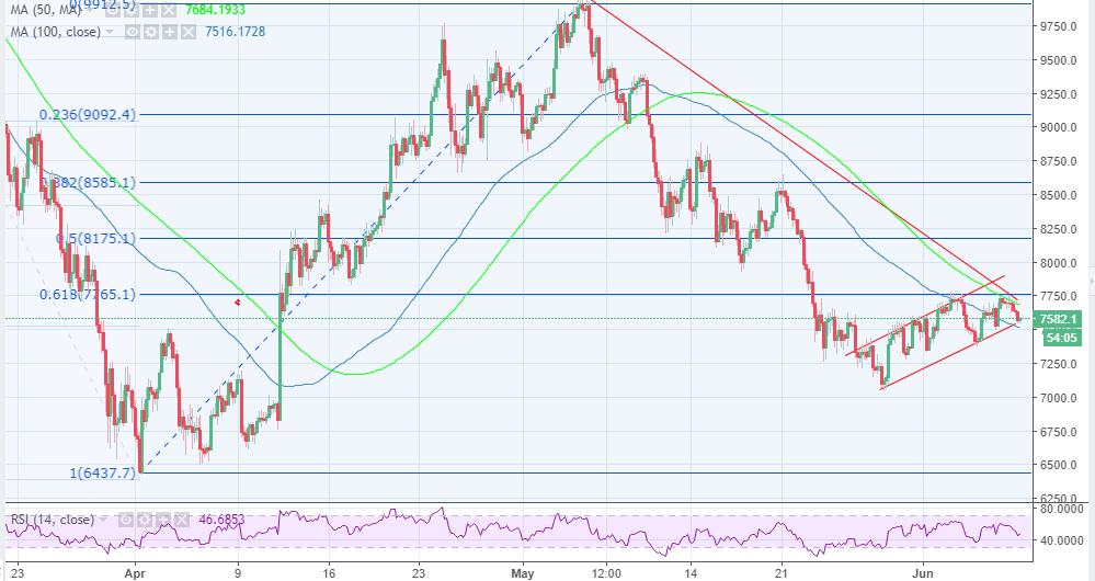 Bitcoin price is trading between the moving average resistance and support. The SMA is preventing declines towards $7,750 while the 100 SMA is offering immediate support slightly above $7,500. There is a breakout to the upside at the 61.8% Fib retracement level with the last swing high of $9,912 and a low of $6,445. BTC/USD is trading a short-term bearish flag pattern pending a downside breakout which could test the next demand zone at $7,250. Bitcoin price is supported at $7,500 but a major support area is at $7,000.
